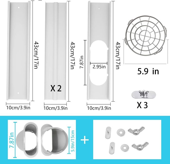 - ❄️【Package Include】:2x43cm/17″ Fixing Plate, 2x43cm/17″ Adjustable Plate, 1x 5.9”coupler filter,1 x Exhaust Hose Adaptor(15cm/5.9″),1 x 5.9″ Exhaust Hose – 59 Inch Length Exhaust Hose, 1x 10 FT Sealing Tape, 3x Screws.Please Check Your Window Size Before Buying.